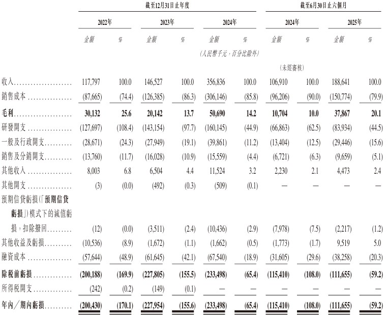 In terms of performance, for the six months ending June 30 in 2022, 2023, 2024, and 2025, the company achieved revenues of approximately RMB 118 million, RMB 147 million, RMB 357 million, and RMB 189 million, respectively; during the same period, the losses for the year/period were approximately RMB 200 million, RMB 228 million, RMB 233 million, and RMB 112 million.