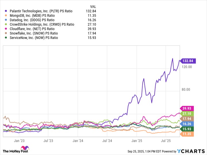 The key observation from the chart below is that Palantir currently trades at a price-to-sales (P/S) ratio of 133 -- a level that towers above its peers in the SaaS sector. On the surface, this simply indicates that Palantir stock commands a premium multiple relative to comparable software businesses.