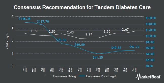 其他股票研究分析師最近也發佈了關於該公司的研究報告。瑞銀集團將 Tandem Diabetes Care 的目標價從 20.00 美元下調至 17.00 美元,並在 8 月 7 日的報告中對該股票給予 “中性” 評級。派珀·桑德勒將 Tandem Diabetes Care 的評級從 “增持” 下調至 “中性”,並在 8 月 7 日的研究報告中將該公司的目標價從 30.00 美元下調至 14.00 美元。巴克萊將 Tandem Diabetes Care 的目標價從 53.00 美元下調至 51.00 美元,並在 8 月 8 日的研究報告中對該公司給予 “增持” 評級。富國銀行將 Tandem Diabetes Care 的目標價從 20.00 美元下調至 13.00 美元,並在 8 月 7 日的研究報告中對該公司給予 “等權重” 評級。最後,加拿大皇家銀行在 9 月 29 日的研究報告中重申了 “買入” 評級,並對 Tandem Diabetes Care 的股票設定了 24.00 美元的目標價。五位研究分析師對該股票給予 “買入” 評級,十一位給予 “持有” 評級,一位給予 “賣出” 評級。根據 MarketBeat.com 的數據,Tandem Diabetes Care 目前的共識評級為 “持有”,共識目標價為 22.19 美元。