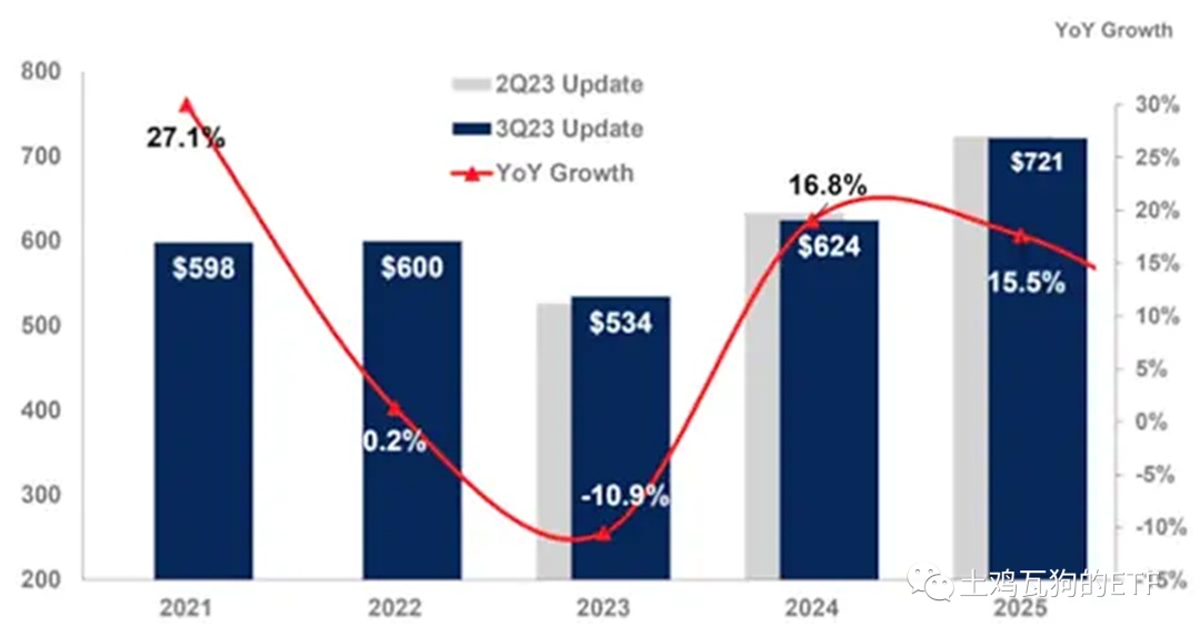 2)存儲芯片市場潛力:美國市場信息諮詢公司 Gartner 表示,全球半導體行業收入預計明年將同比增長 16.8%,將主要來自存儲芯片需求的激增。Gartner 預計,2024 年全球半導體行業銷售額將達到 6240 億美元,高於今年的 5340 億美元。