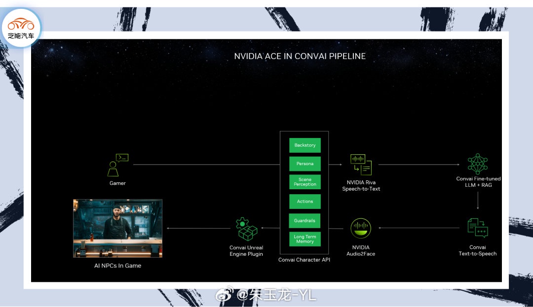 NVIDIA Avatar Cloud Engine (ACE) 引起特別關注,作為一個雲 API,支持實時智能遊戲角色(NPC)與用户進行自然語言交互。相較於以往嚴格的腳本,ACE 允許玩家通過大語言模型聊天機器人進行更自由的對話,實現實時視覺和音頻反饋。這一技術的引入為遊戲體驗帶來了更加沉浸式的互動方式,將 NPC 的表現提升到一個新的水平。