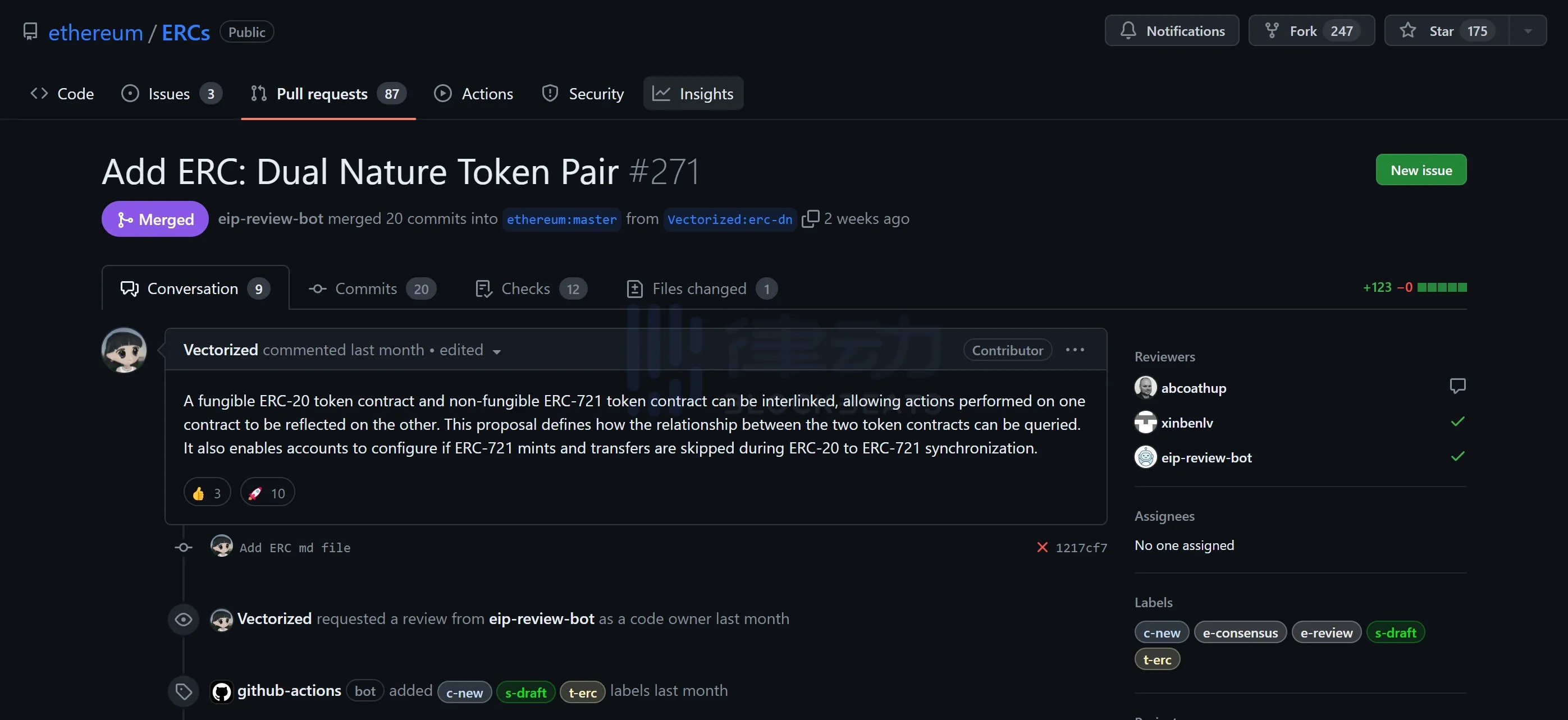 DN404 其實也不是新協議了,在 2 月份的時候就引起過關注。一個是因為其開發團隊陣容強大,包括 ERC-721A 的作者 @optimizoor 以及 ERC-5643 的作者 @0xCygaar 等人。另一個是因為其嚴格遵守現有以太坊標準,最有可能成為正式的 ERC 標準。2 周前,@optimizoor 在以太坊 Github 上發起的 ERC 增添請求已經進入到了「Merged」狀態,DN404 在朝着變為 ERC-7631 的道路上邁進了一步。