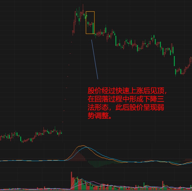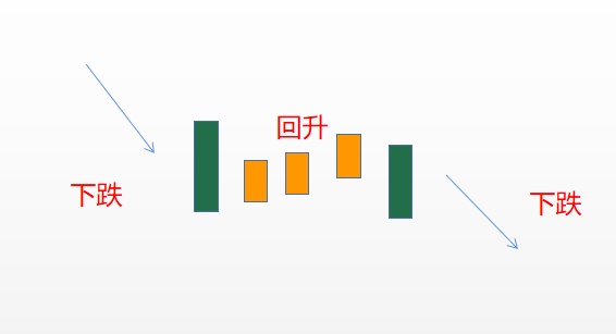 下降三法指下跌弱勢調整,持續形態,後市看跌,無須確認形態。