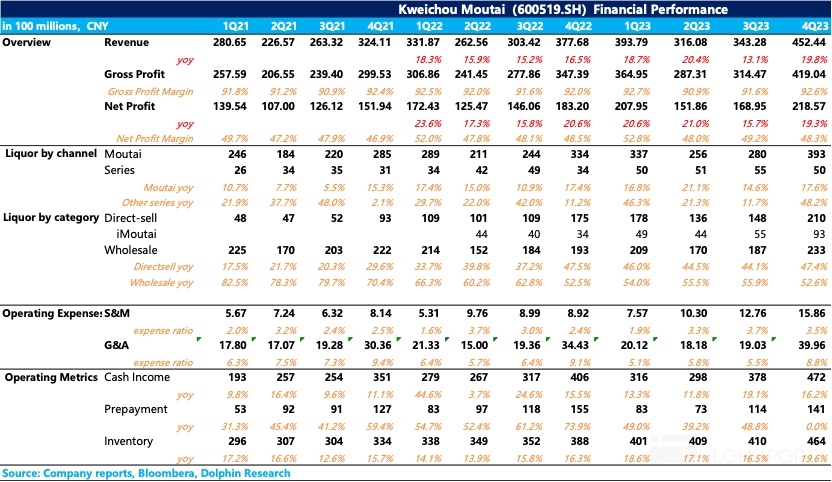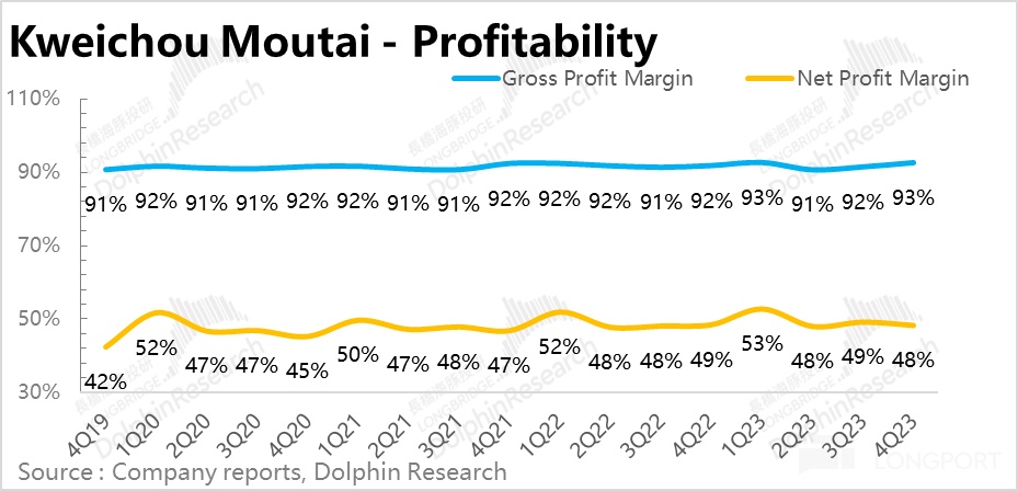 從利潤率角度來看,由於經銷提價,公司的毛利率進一步拉高到了 93%,但淨利潤率由於四季度消費税、銷售費用等同比有所拉昇,把毛利率的提升幅度又侵蝕了回去,導致淨利潤率層面沒有提升,反而下降了將近一個百分點。