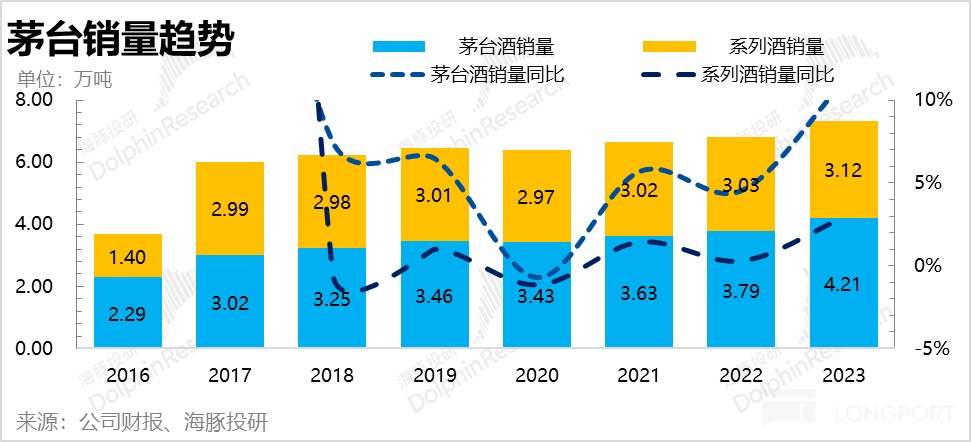 公司給 2024 年又定了一個 15% 的增長目標,跟 2023 年完全一樣。由於茅台酒的當年的銷量在五年前通過基酒產量已經成型,2019 和 2020 年兩年茅台酒的基酒銷量都沒什麼增幅。