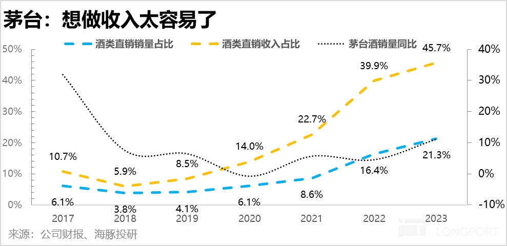 b)今年再進一步提高對直銷的銷量佔比:以 2022 年為例,茅台酒銷量增速只有 4.5% 的時候,通過拉高直營銷量佔比,茅台輕鬆就做到了同比接近 17% 的收入增長。