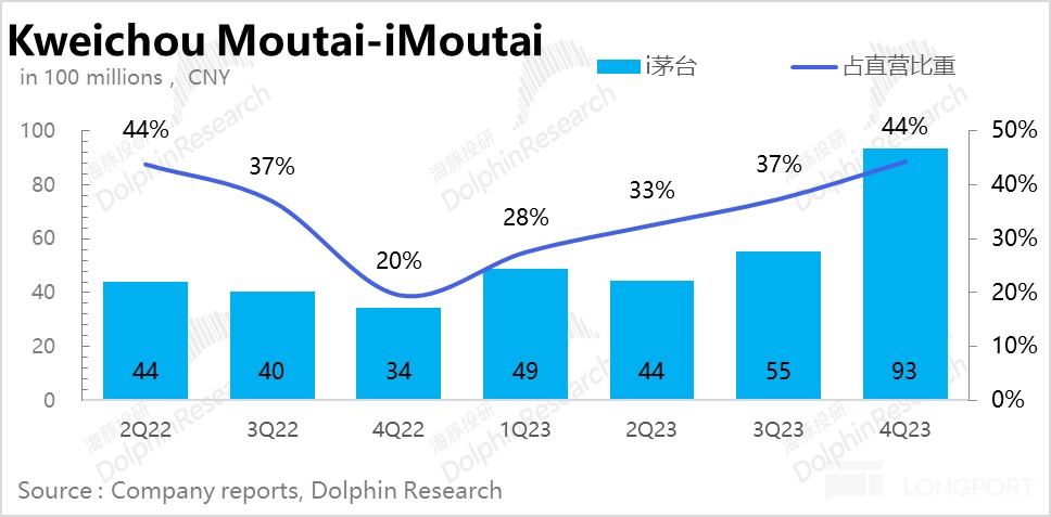 但直營並非無事可做,在線下、線上兩個直營渠道中,茅台還在不斷提高線上直營的佔比。到 2023 年四季度,以 iMoutai 為主的線上直營收入,已經佔到了直營總收入的 44%,應該與這種搶貨式線上直營在茅台宣傳效果(提升 APP DAU)、物流分發效率上會更高一些。