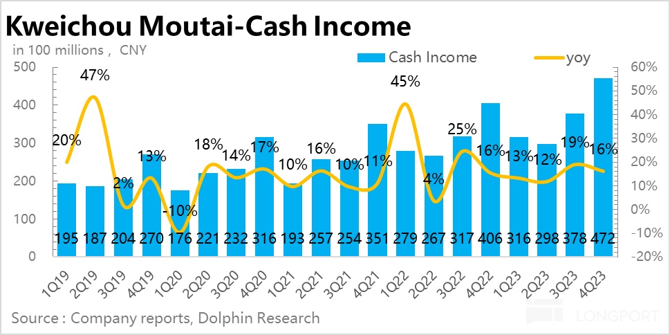 不過,四季度現金收入(預付款增加值 + 主營收入)相比三季度的增速反而放緩到了 16%,主要因為經銷商預付款增速負增長較為明顯,尤其是 11 月份提價的情況下,茅台收到的經銷商的付款餘額並不多。