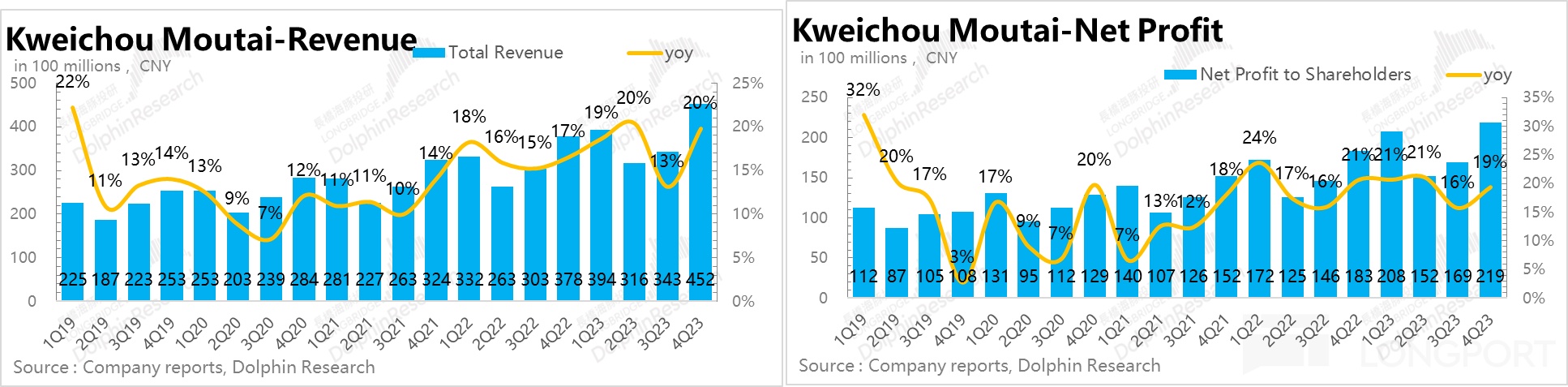 在茅台酒經銷提價、系列酒加速增長的推動下,去年四季度茅台公司的總收入做到了 452 億,同比增速拉到了 20%,淨利潤幾乎同比增長,增速達到 19%。