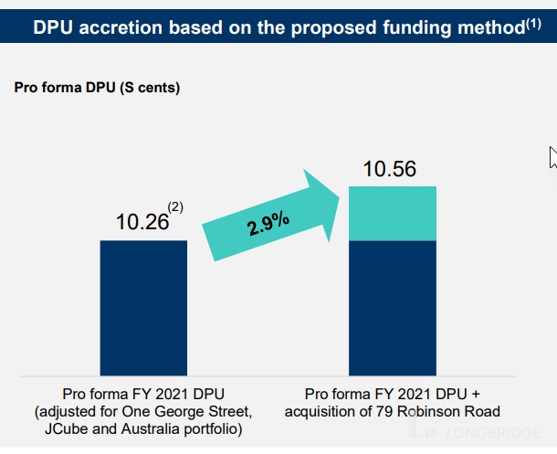 再來,CICT 也在準備進行收購新加坡 CBD 商區 79 Robinson Road 的寫字樓,作價 8.69 億新元,屆時產業淨收入可增加 4%,而股息也可以增加,預期從 10.26cents 提高至 10.56cent。