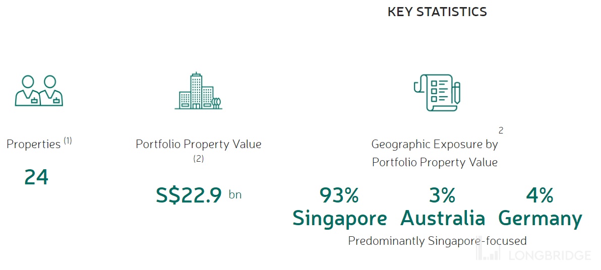 目前,CICT 資產分佈 3 個國家,共有 24 項資產,分別是新加坡(93%)及德國(4%)及澳大利亞(3%)。資產以寫字樓及商場為主,出租率皆超過 90%,屬於相當穩定。