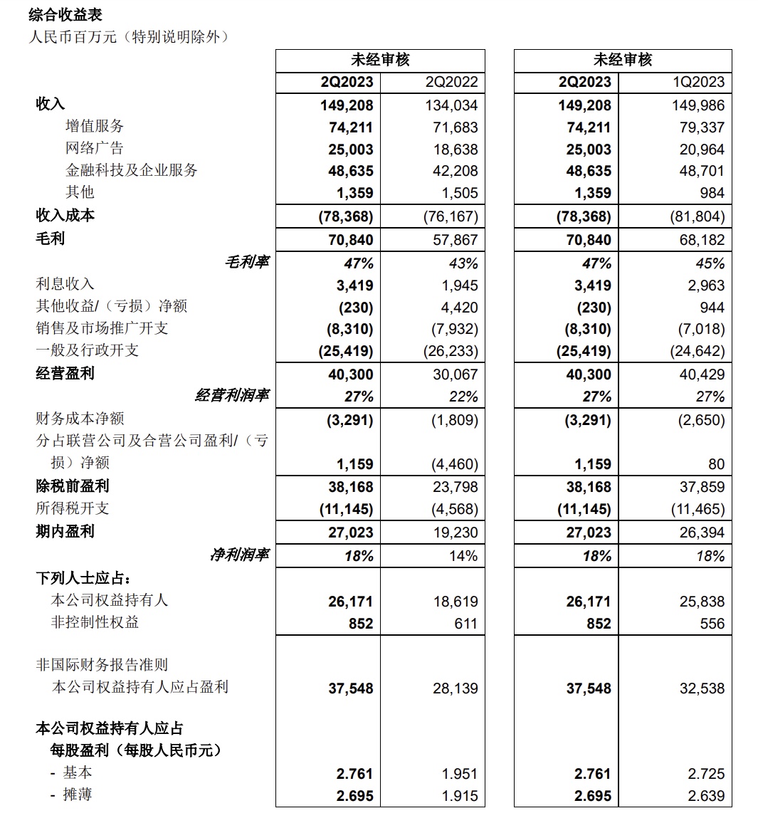 2023 年 8 月 16 日 – 中國領先的互聯網增值服務提供商——騰訊控股有限公司(“騰訊” 或 “本公 司”,香港聯交所股票編號: 00700)今天公佈截至 2023 年 6 月 30 日止第 2 季及上半年未經審核綜合業績。