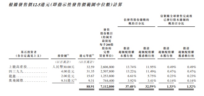多名基石投資者同意按發售價認購可供認購的發售股份數目,總額約 0.89 億港元(假設超額配股權未獲行使)。基石投資者包括上饒高鐵經濟試驗區產業投資發展有限公司,四三九九網絡有限公司,香港龍鑫有限公司及奧飛數據國際有限公司。