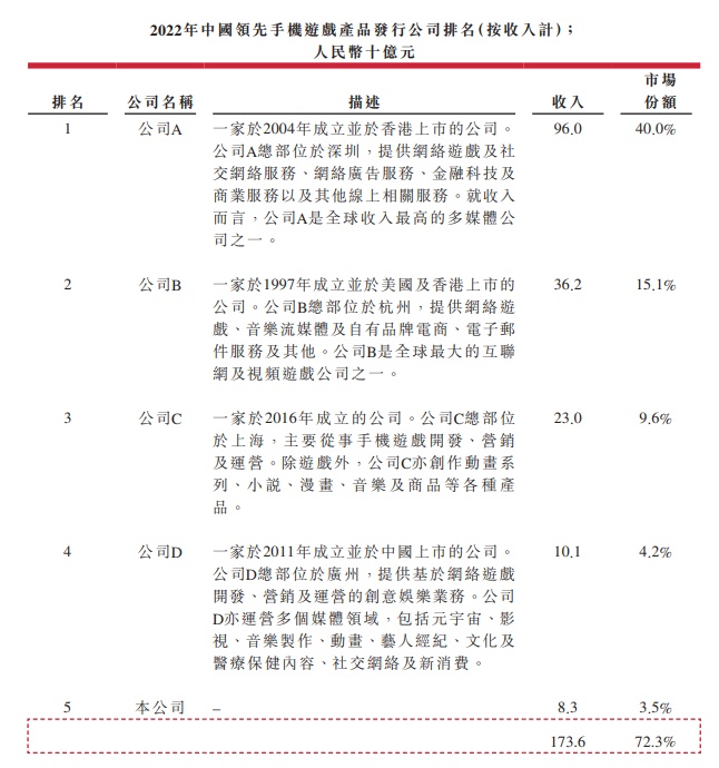 中旭未來是中國的網絡遊戲產品發行商,致力於在中國營銷及運營網絡遊戲(尤其是手機遊戲),由客户開發並由公司營銷及運營的網絡遊戲通過 “貪玩遊戲” 品牌向玩家提供。根據弗若斯特沙利文的資料,按收入計,公司是中國第五大手機遊戲產品發行公司,佔 2022 年總市場份額的 3.5%。於 2022 年,中國手機遊戲市場的四大參與者佔中國手機遊戲市場總市場份額超過 60%。這幾年國內遊戲市場逐漸向移動手遊市場傾斜,而中旭未來能在手遊市場中佔據一塊不小的份額,足以説明其競爭力。