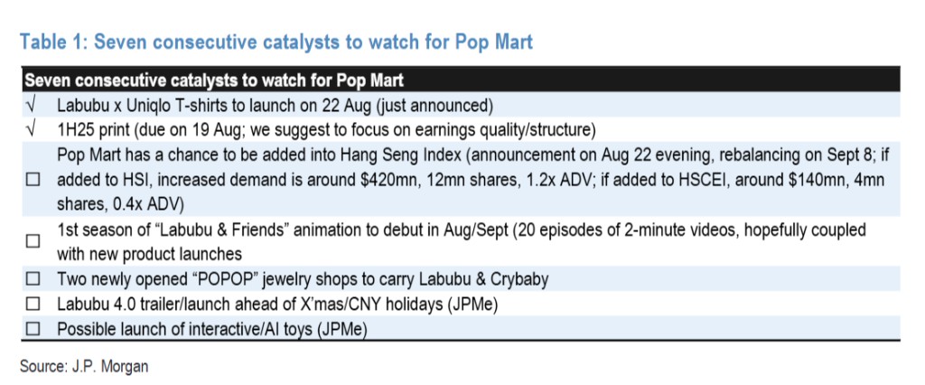 摩根大通在研報中列出了泡泡瑪特的七大連續催化劑,包括:Labubu 與優衣庫聯名 T 恤將於 8 月 22 日推出;有機會被納入恒生指數;《Labubu & Friends》動畫第一季將於 8 月/9 月首播;Labubu 4.0 預告片/聖誕節/春節假期前發佈等。