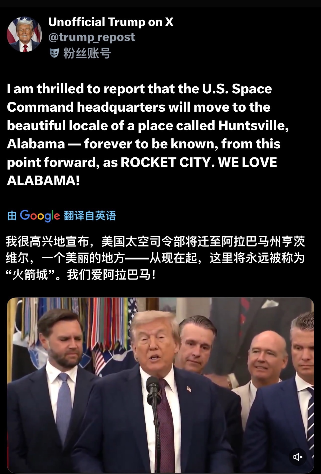 2025 年 9 月 2 日,川普宣布:美国太空司令部总部将从科罗拉多斯普林斯迁至阿拉巴马州亨茨维尔。这意味着拜登政府在 2021–2023 年间反复确认的 “留在科罗拉多” 的决定被推翻。川普强调亨茨维尔是 “Rocket City”,是美国航天和导弹发展史的重要城市。与 “金穹” 计划联动:川普 2025 年 5 月提出的 “Golden Dome” 太空导弹防御体系(类似以色列的 Iron Dome,但规模更大),目标是通过卫星星座、导弹防御系统建立全天候的战略屏障。迁址亨茨维尔被外界认为是为了靠近导弹防御局(MDA)、NASA 马歇尔太空飞行中心,以及在地面导弹、无人机、传感器等防务产业链高度集中的本地军工圈。