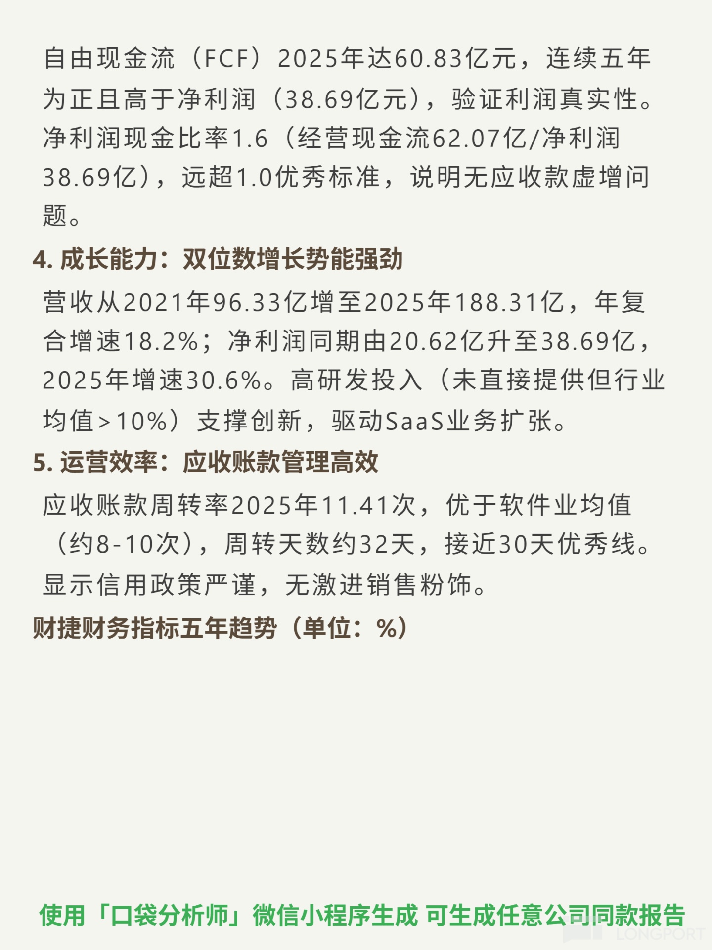 📈Financial highlights: 2021-2025 revenue CAGR 18.2% (¥9.633B→¥18.831B); 2025 ROE 20.29%, gross margin 80.76%, net margin 20.55%; FCF ¥6.083B (5-year positive streak exceeding net profit); subscription model drives highly predictable cash flows with LTV far exceeding CAC.