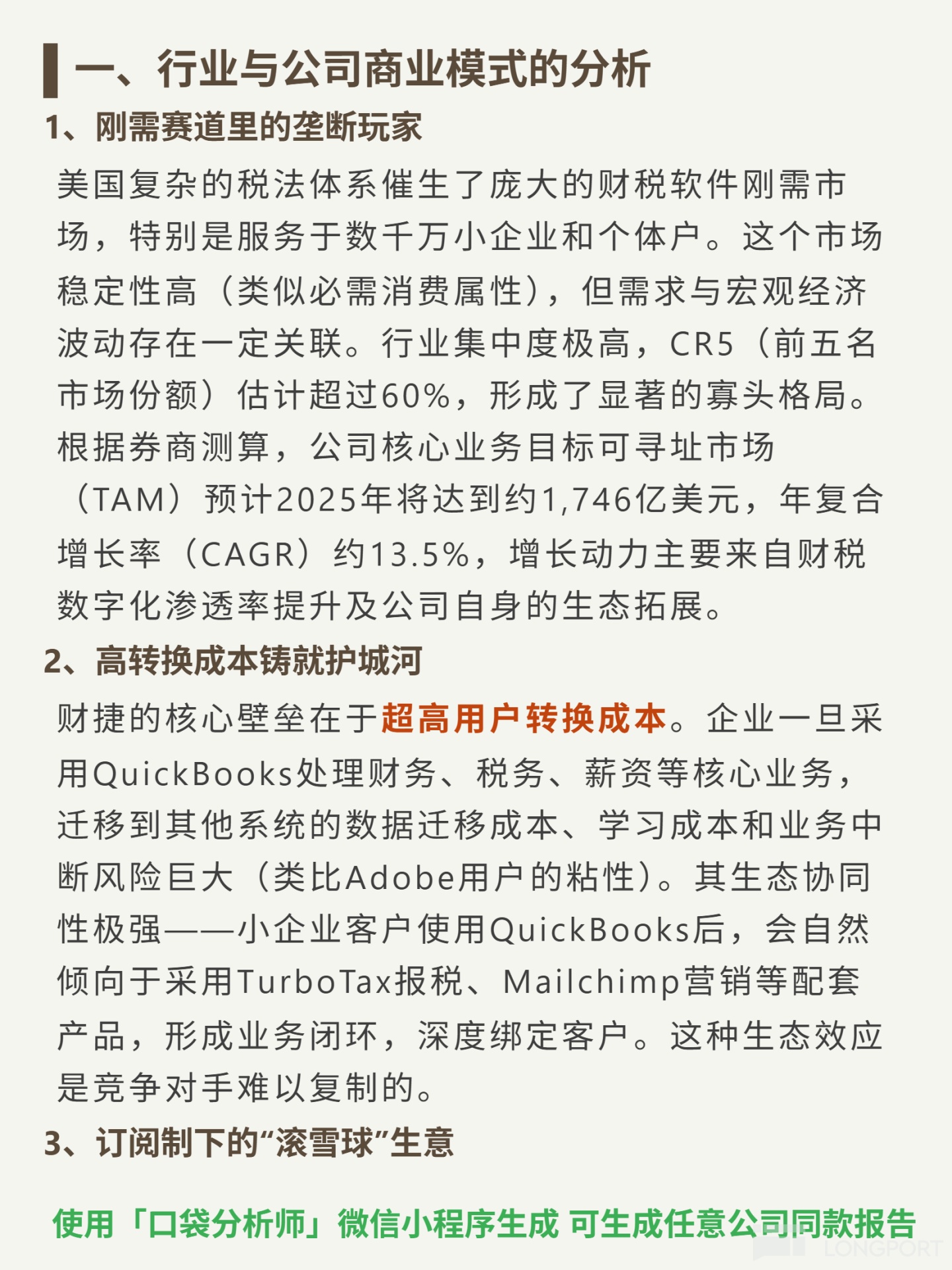 🎯Core logic: US tax software oligopoly serving tens of millions of SMBs, sole proprietors and consumers; SaaS subscription-based model leverages data migration/learning costs to build switching cost barriers; ecosystem synergy maximizes customer value.