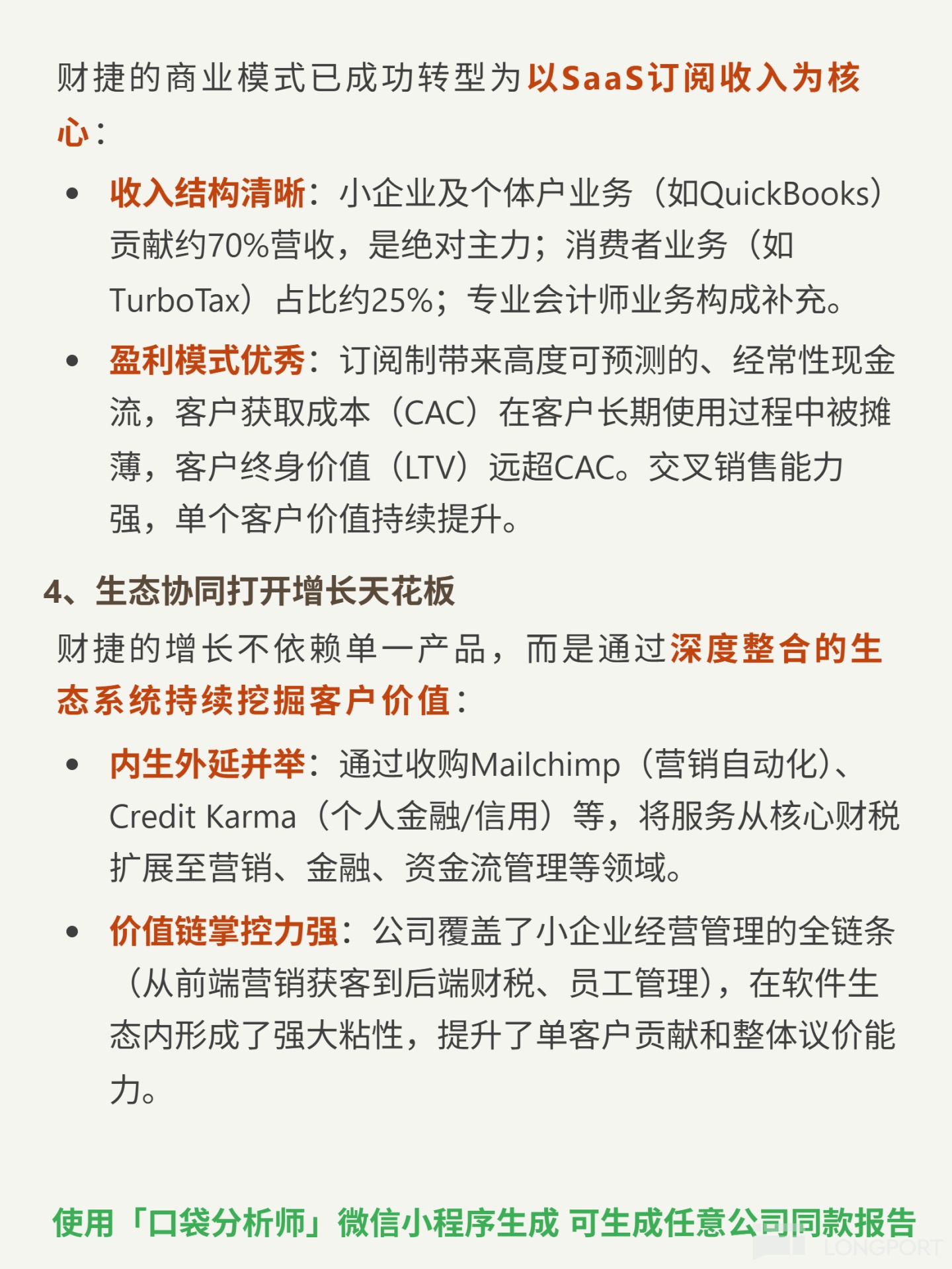 🔍Ecosystem synergy: Acquired Mailchimp (marketing) and Credit Karma (finance) to expand into marketing/financial services; covers full SMB operation chain (marketing→finance→HR); data flywheel effect (cross-business data empowerment) enhances competitiveness.