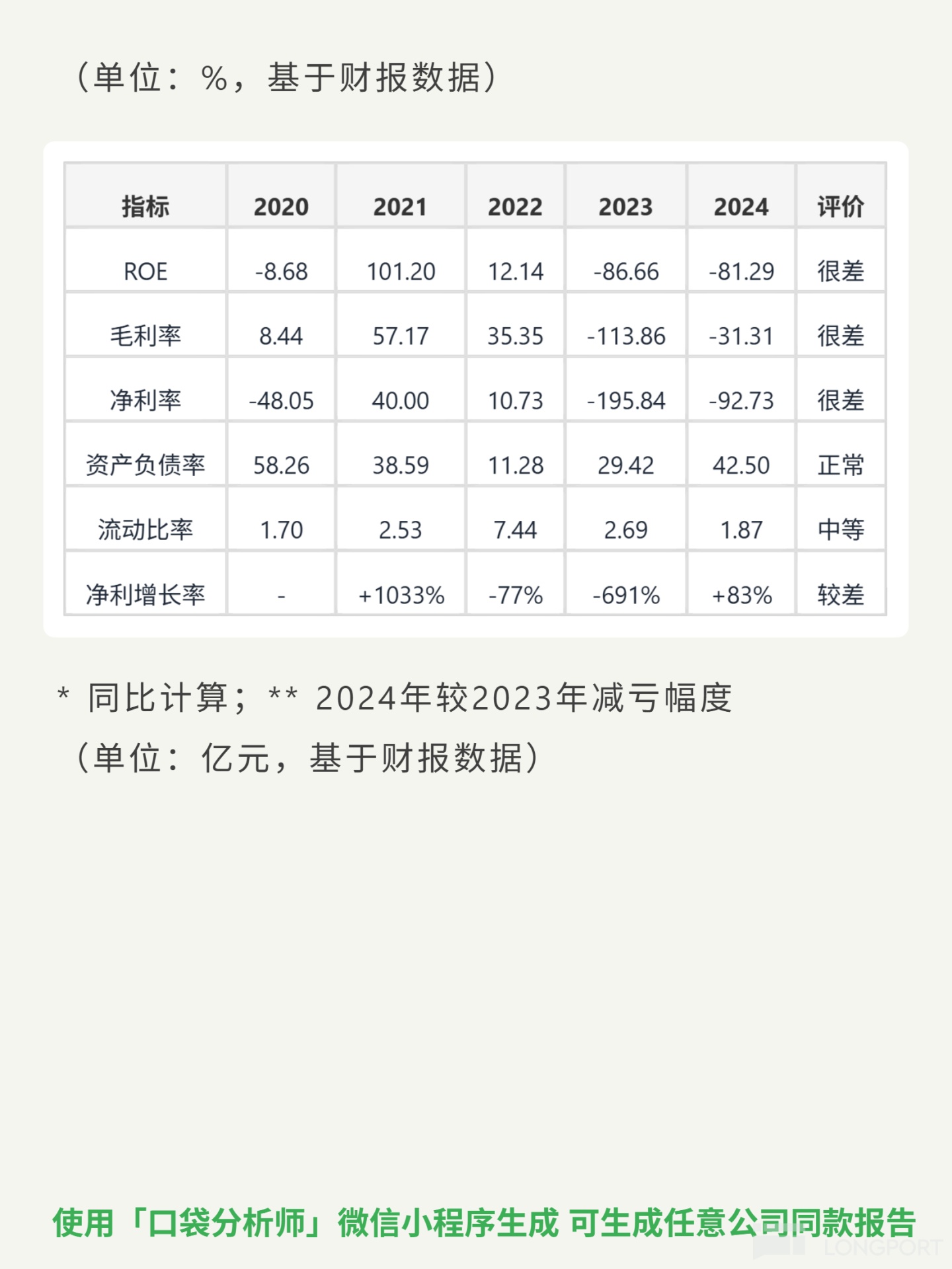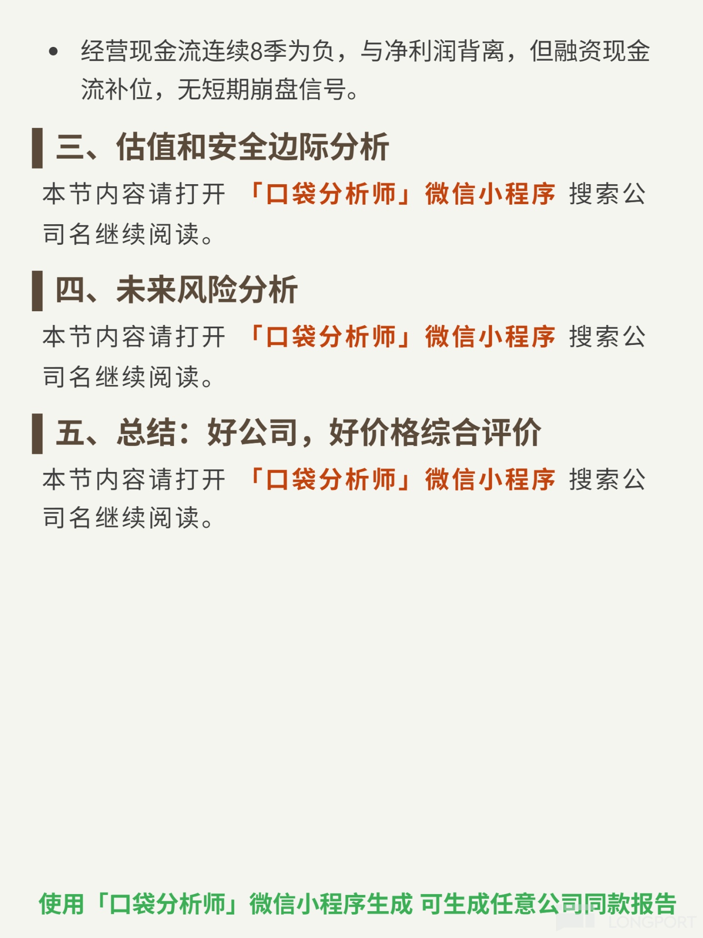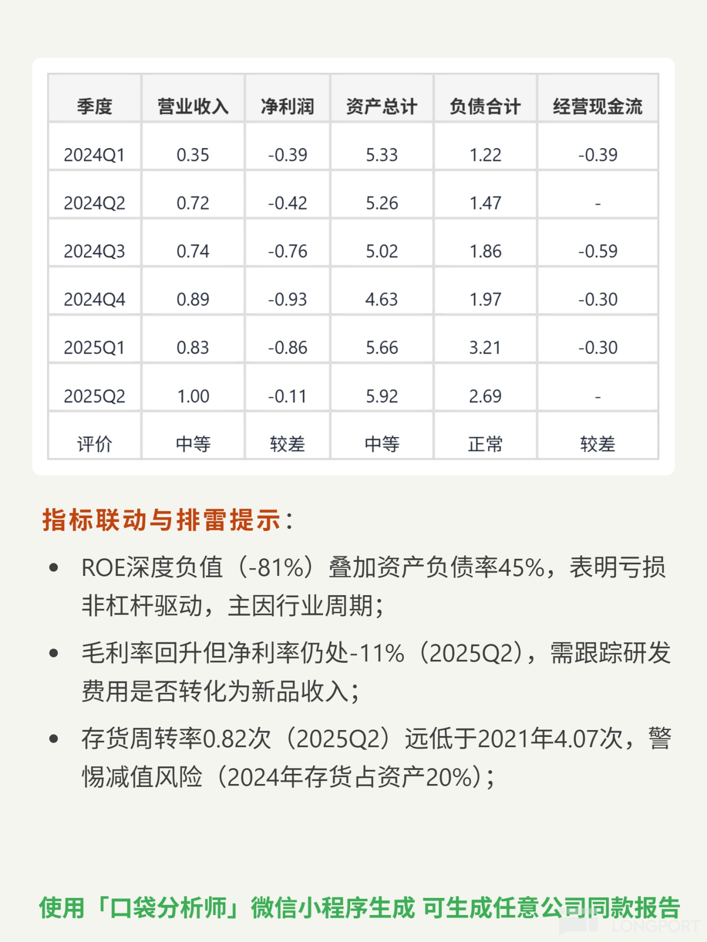- 经营现金流连续 8 季为负,但融资补位,无短期崩盘风险。