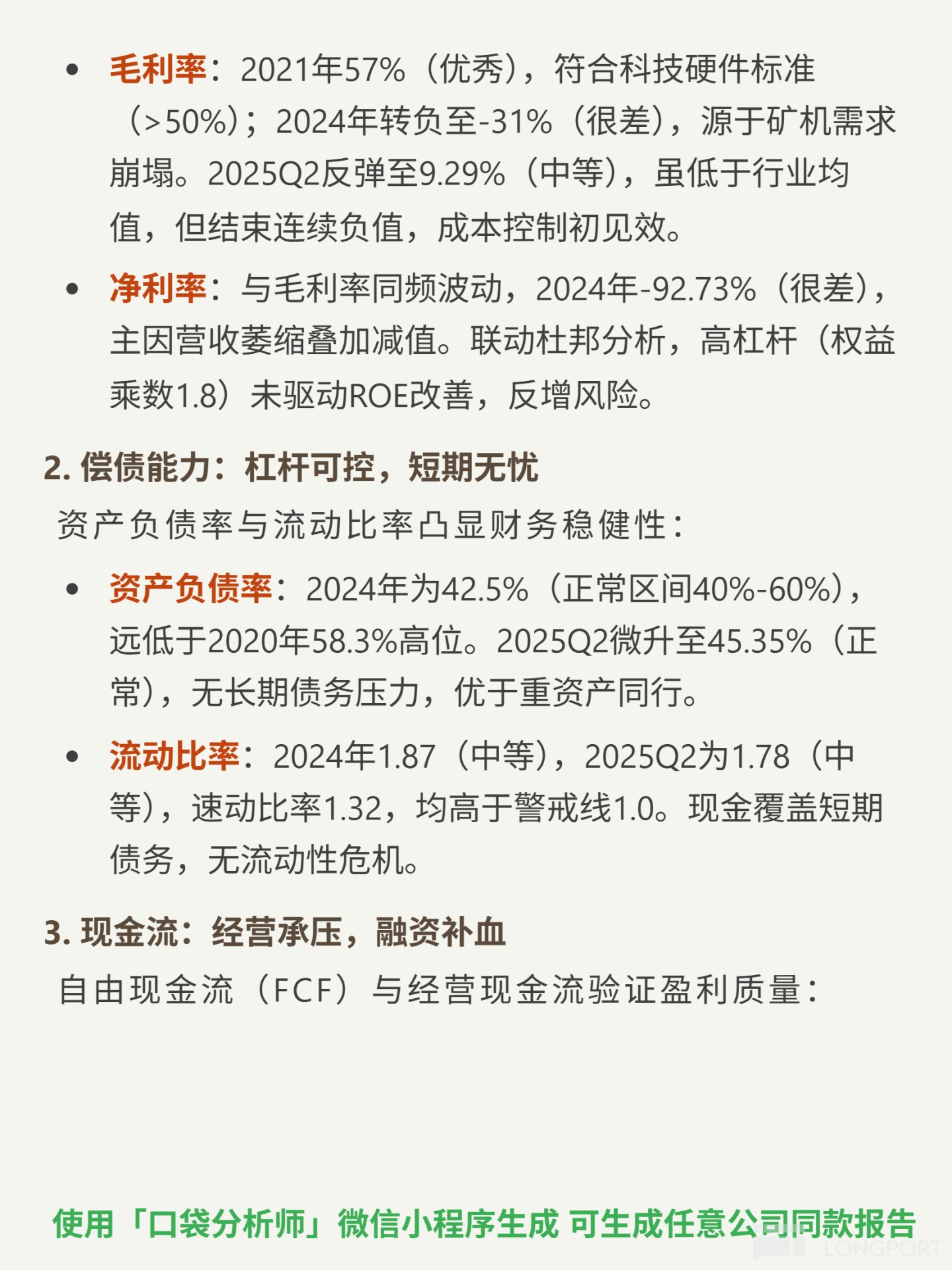 $嘉楠科技(CAN.US)$比特大陆(BTDLL.HK) $赛目科技(02571.HK) 挖了嘉楠科技(CAN.US)的研报,核心发现是这家比特币矿机龙头的业绩随行业周期剧烈波动,但 2025Q2 财务边际改善信号显著。