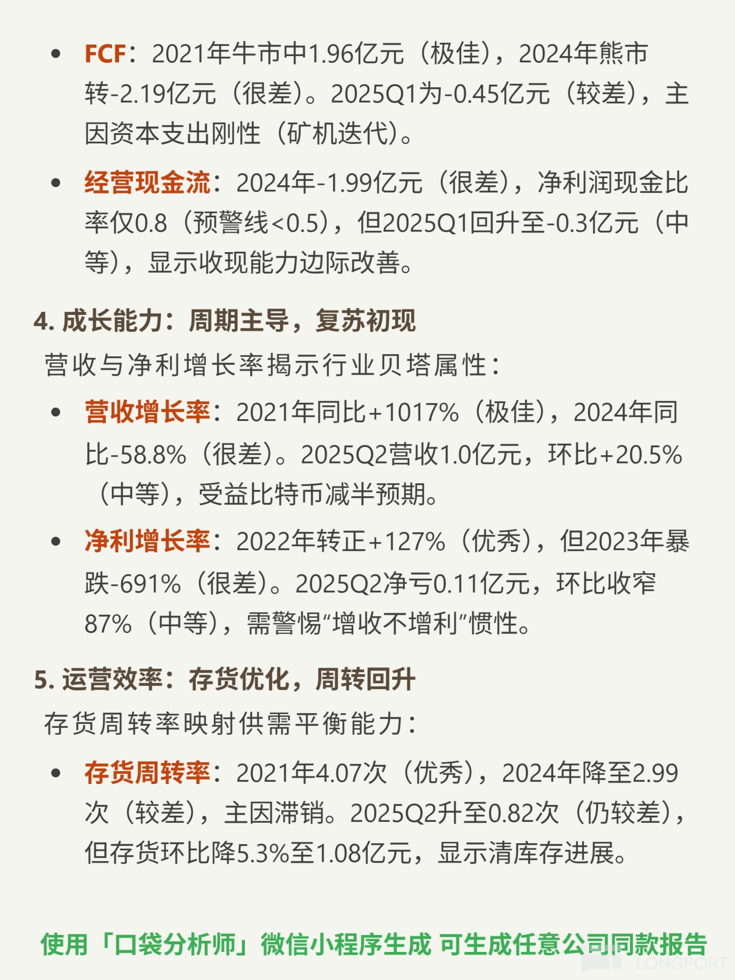 - 2025Q2 营收 1.0 亿元,环比 +20.5%(受益比特币减半预期);净亏 0.11 亿元,环比收窄 87%。